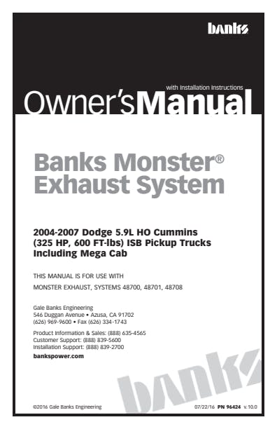 The 4 inch Monster exhaust system flows up to 122 percent better than stock and virtually eliminates backpressure. The Banks-designed expansion chamber dissipates the annoying mid-range exhaust drone that accompanies most straight-through mufflers. Banks streamlined 4 inch turbine outlet pipe with provision to retain stock catalytic converter, intermediate pipe(s) and tailpipe are formed of stainless, heavy-wall tubing with constant-diameter bends to maximize airflow and lower exhaust gas temps. Banks replaces the factory's restrictive muffler with a polished-stainless Monster muffler featuring a straight-through 4 inch diameter path that flows up to 129 percent better than stock. The Banks-designed expansion chamber dissipates the annoying mid-range exhaust drone that accompanies most straight-through mufflers. Monster muffler utilizes spun ceramic, very-high-temperature packing and delivers an authoritative - but never intrusive - exhaust sound. And the 5 inch polished rolled-edge tip has an adjustable clamp for positioning on tailpipe. Get it in your choice of chrome-over stainless or high temp black! (And to help keep it looking good, there's a 1/2 inch air gap to keep heat from tarnishing the finish)