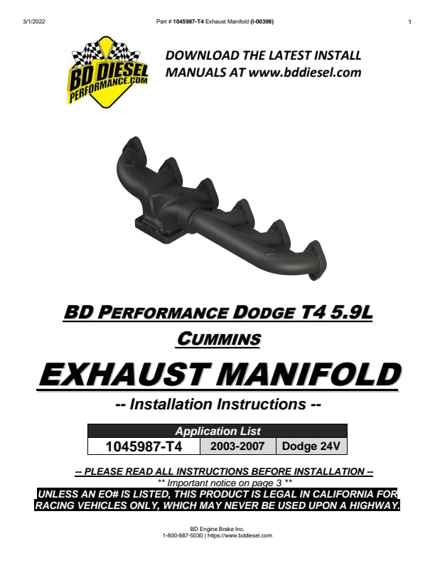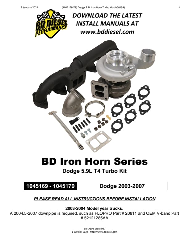 - Kit includes a 5.9L 2-piece BD high flow pulse T4 manifold and gaskets