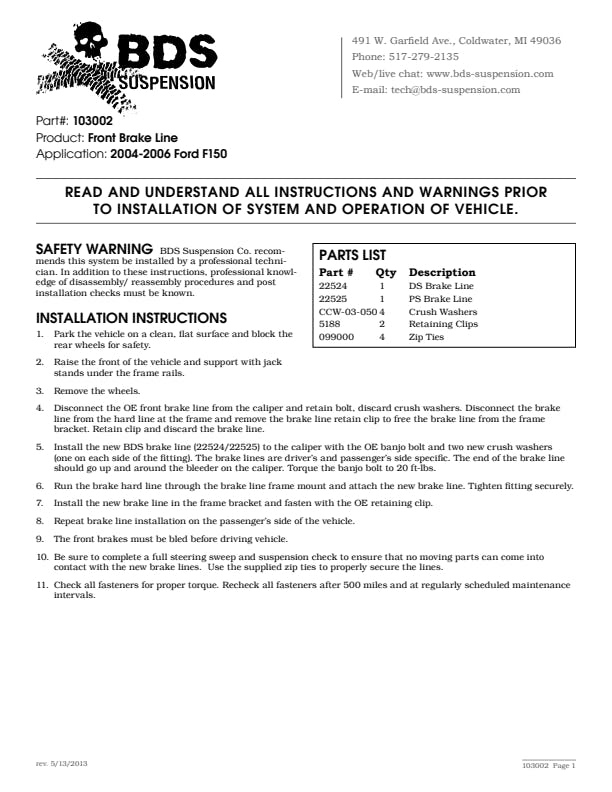 Improve safety and style by upgrading the front brake lines on your 4WD 2004-2008 Ford F150 with a set of BDS front brake lines. Specially designed for vehicles with a 6 to 8-inch lift, these front brake lines are built with stainless steel braided hose and feature a kevlar liner for an improved brake pedal feel.