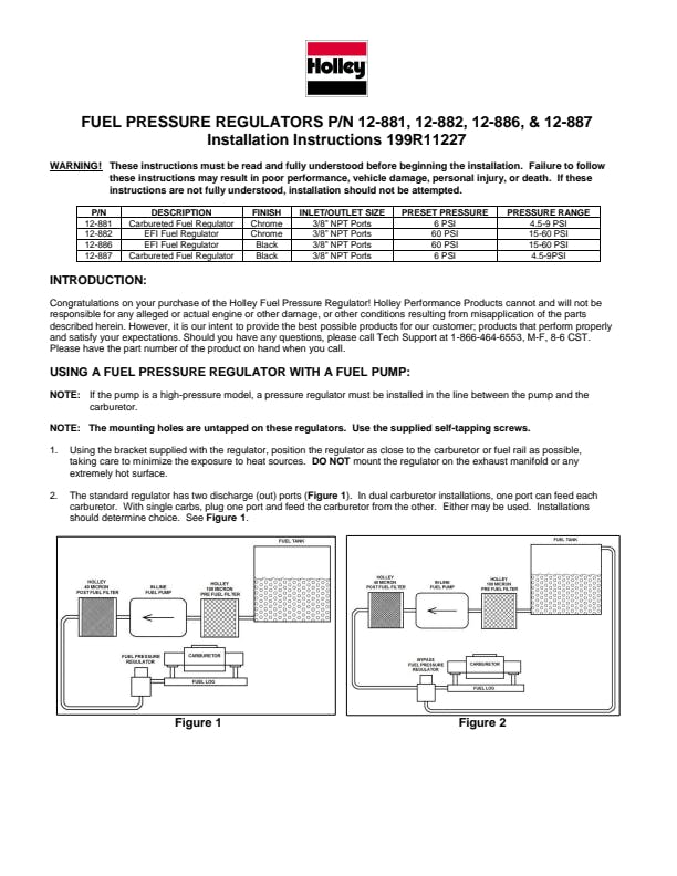 Holley does it again with their new die cast aluminum by pass style fuel pressure regulators. The same Holley quality that you expect at a price point that every budget can handle. 1/8" NPT barb fitting for boost reference port included.