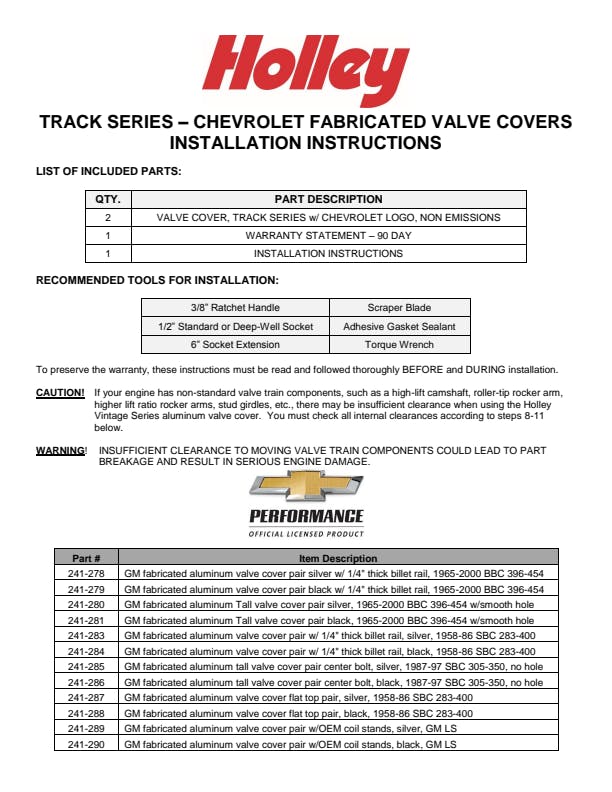Holley is pleased to release its latest fully licensed product--GM Track Series Fabricated Aluminum Valve Covers. The GM Track Series family of valve covers gives you an excellent way to add a high-end fabricated look combined with a lightweight and tough valve cover for your favorite Chevy engine. These valve covers are constructed of 6061 T5 sheet aluminum, feature a laser etched "Chevrolet" and Bow Tie logo, and precision TIG welded for a proper fit. They are available in silver anodized or black coated finishes along with various heights to clear most popular rocker arm combinations. All of our valve covers include mounting hardware for quick and simple installation.