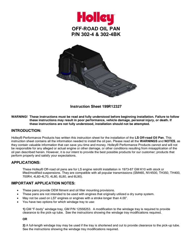 Maximum crankshaft stroke = 4.00" Sump Oil Capacity - 5.6 Quarts Total Oil Capacity with stock oil filter - 6.1 Quarts Mr. Gasket 78080G or equivalent high-quality RTV sealer Oil Pan Gasket (Mr. Gasket P/N 6665G, GM® 12612350, or equivalent) Oil Filter (AC Delco®, PF48 or PF48E, Mobile M1-113, Wix 57060, K&N HP-1017, or equivalent) Requires use of Holley 302-15 Dipstick and Tube Kit or LS3 dipstick (GM P/N 12669528) and tube (GM P/N 12625031) Compatible with all popular transmissions (SM465, NV4500, TH350, TH400, 700R4, 4L60-4L70, 4L80, 6L80 and 6L90). Windage tray options: 1) GM "F-body" windage tray, GM P/N 12558253 or 2) A full-length windage tray may be used if the tray is shortened and cut for pick-up tube clearance. *Modification is required to provide clearance to the pick-up tube on both options. See instructions for further details on the windage tray modifications required. These pans are not intended to be used with engines that originally utilized a dry sump system.