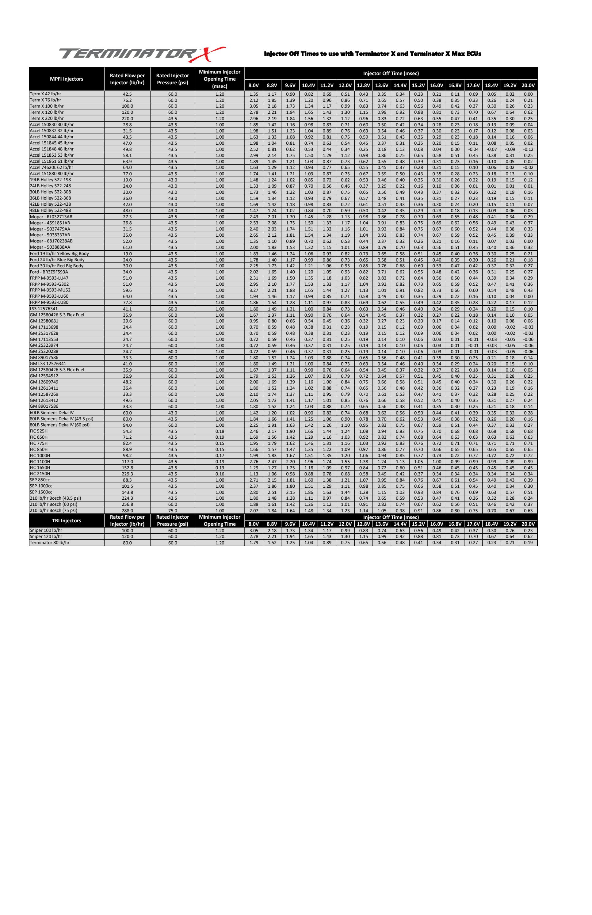 Terminator X High Impedance Fuel Injectors feature a precision lapped disc valve, high-quality brass windings, and high-temp o-rings. These injectors provide excellent linearity with no discernible "bounce" at low pulse widths as commonly found in other injectors. With a wide variety of fuel flow offerings from 42 lb./hr. to 220 lb./hr. (441 cc/m to 2310 cc/m) you are sure to find an injector that matches your non-emissions controlled application. These high quality fuel injectors can also be used with any ECU that utilize high impedance fuel injector drivers.
