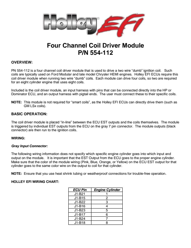 Included is the coil driver module, an input harness with pins that can be connected directly into the HP or Dominator ECU, and an output harness with pigtail ends. The user must connect these to their specific coils.