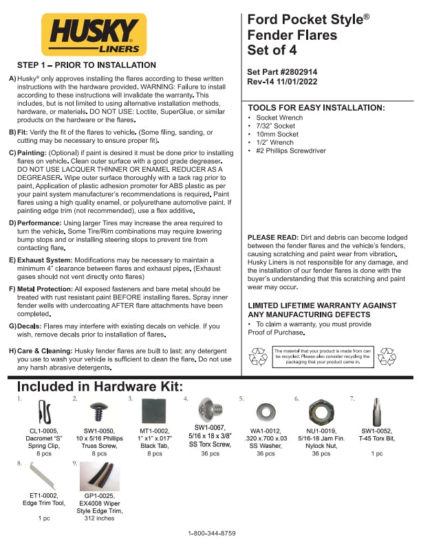 - Pocket Style Fender Flares are covered by Husky Liners Limited Lifetime Warranty, featuring Husky's legendary durability, so they're built to last. Proudly made in the USA with global materials.