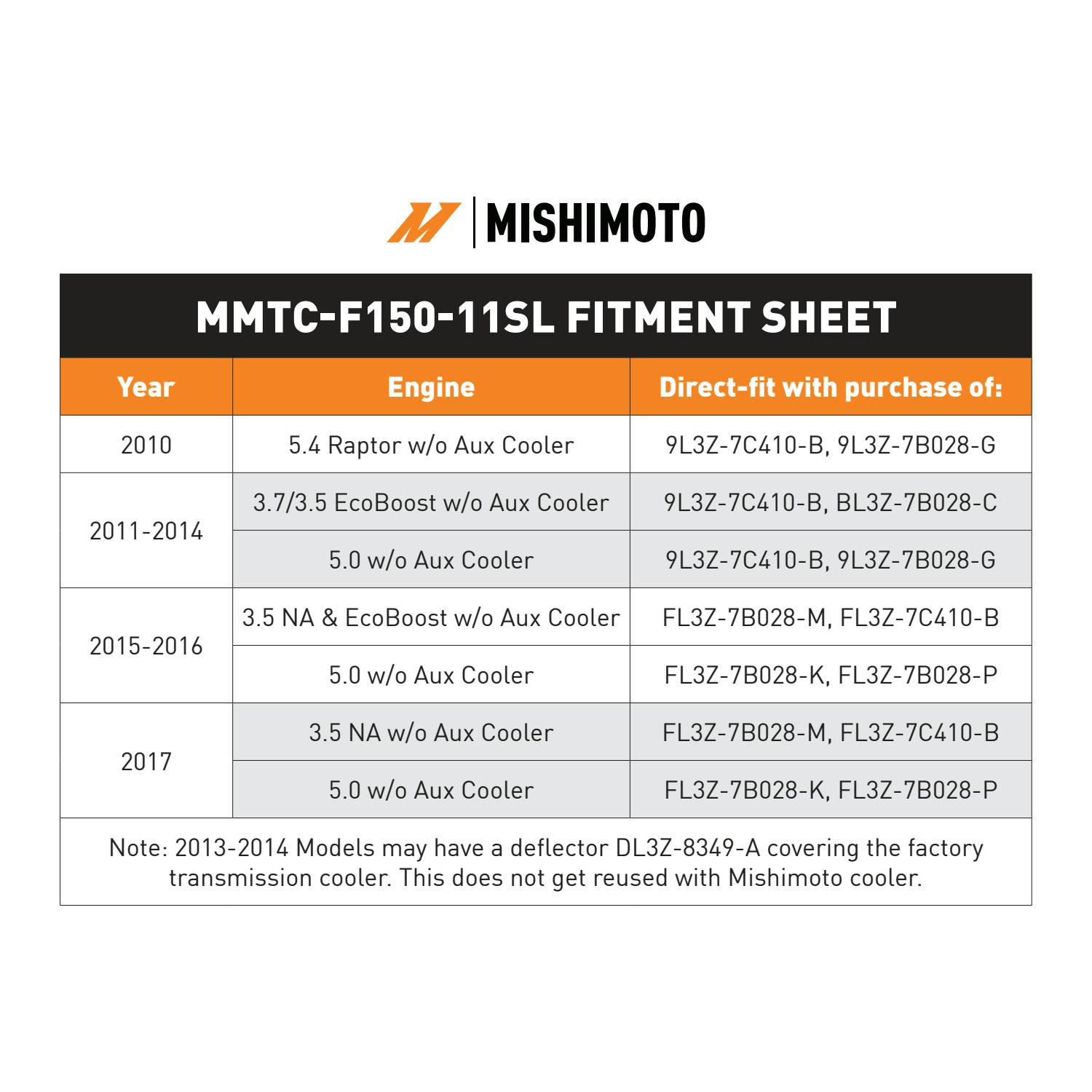 Minor trimming of the factory transmission cooler lines is required to fit the Mishimoto transmission cooler. Please see the included note card or the installation instructions for more details.----This cooler is designed to fit vehicles with the factory-installed liquid-to-air transmission cooler.----Vehicles without this transmission cooler may require additional hoses to connect this cooler to the factory transmission cooling circuit. Please see our guide for which hoses your vehicle needs or contact our customer service team., Minor trimming of the factory transmission cooler lines is required to fit the Mishimoto transmission cooler. Please see the included note card or the installation instructions for more details.----This cooler is designed to fit vehicles with the factory-installed liquid-to-air transmission cooler.----Vehicles without this transmission cooler may require additional hoses to connect this cooler to the factory transmission cooling circuit. Please see our guide for which hoses your vehicle needs or contact our customer service team. |