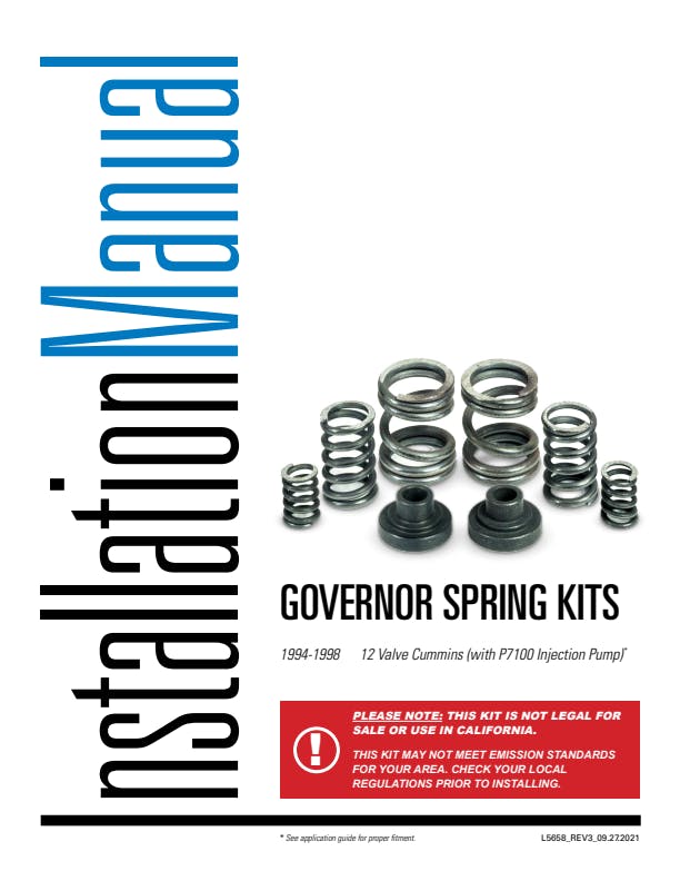 Governor Spring Kit for Dodge 1994-1998 Cummins 12 Valve Engine with a P7100 injection pump. Pacbrake offers a wide variety of spring kits for all applications of 6BT and 4BT Cummins engines. Whether you are installing an exhaust brake or governor spring kits we have the kit for you. Heavy duty valve springs are Cummins OEM 3916691 white strip springs. The 60lbs spring is required for exhaust brake applications and is suggested for all governor spring installs. Governor spring kits allow the Bosch P7100 to spin the engine RPM up to 4000 RPM. Each kit comes complete with parts for either 3000 or 4000 RPM. Pacbrake's governor spring kits are recommended for vehicles that have 5 speed standard transmissions. They are perfect for those who tow heavy loads and want more responsive power. Please Note: This kit is not legal for sale or use in California. This kit may not meet emission standards for your area. Check your local regulations prior to installing. Details: Application Dodge 1994-1998 Cummins 12 Valve. Pacbrake Series. Valve 12 Valve. Engine Manufuacturer Cummins. Engine Years 1994-1998.
