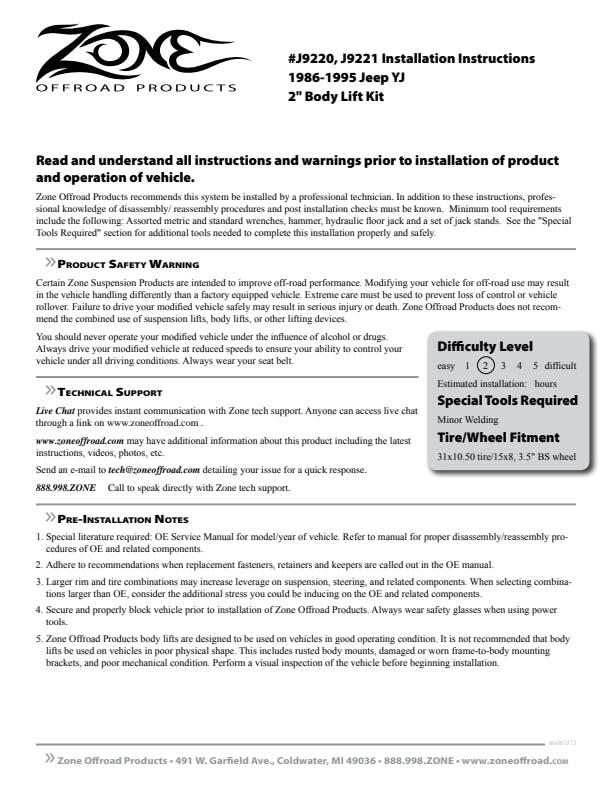 Take the road less traveled with this 2 body lift kit that allows you to fit tires up to 32. Each kit includes high-grade body bolts and Zone Offroad's Crush-Proof body blocks to fit your 1987 - 1995 Jeep Wrangler (YJ) Gas model. It’s easy to install, so what’s stopping you?